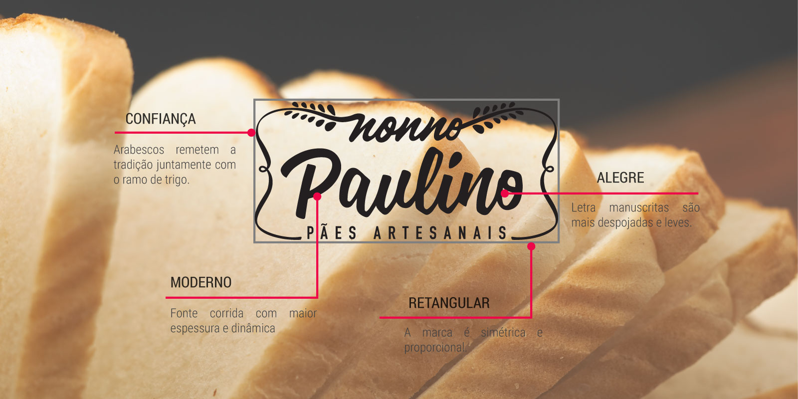 O arabesco envolvendo o nome Paulino delimita a marca e trás o caráter tradicional e sério. Os ramos de trigo simbolizam a principal matéria prima do pão. Além disso, o trigo tem seu significado relacionado a tradição.