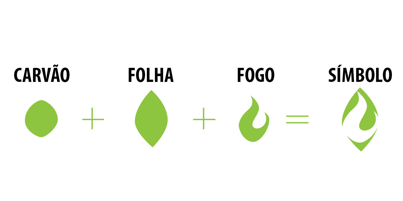 A marca trás a referência visual dos 3 símbolos principais do qual ela vai tratar: carvão, folha e e fogo. Com essas três fatos podemos retirar nossas referências visuais.O elemento da folha mais o fogo por cima da marca transmite energia e destaca o uso do produto. A tipografia arredondada transmite leveza à marca, e reforça o caráter orgânico. A segunda fonte usada para a descrição do produto foi escolhida por ter facilidade de leitura e contrastar com a fonte principal. A marca tem uma estrutura piramidal que inicia pelo símbolo criado pela junção de PRODUTO + IDEOLOGIA E RESULTADO.