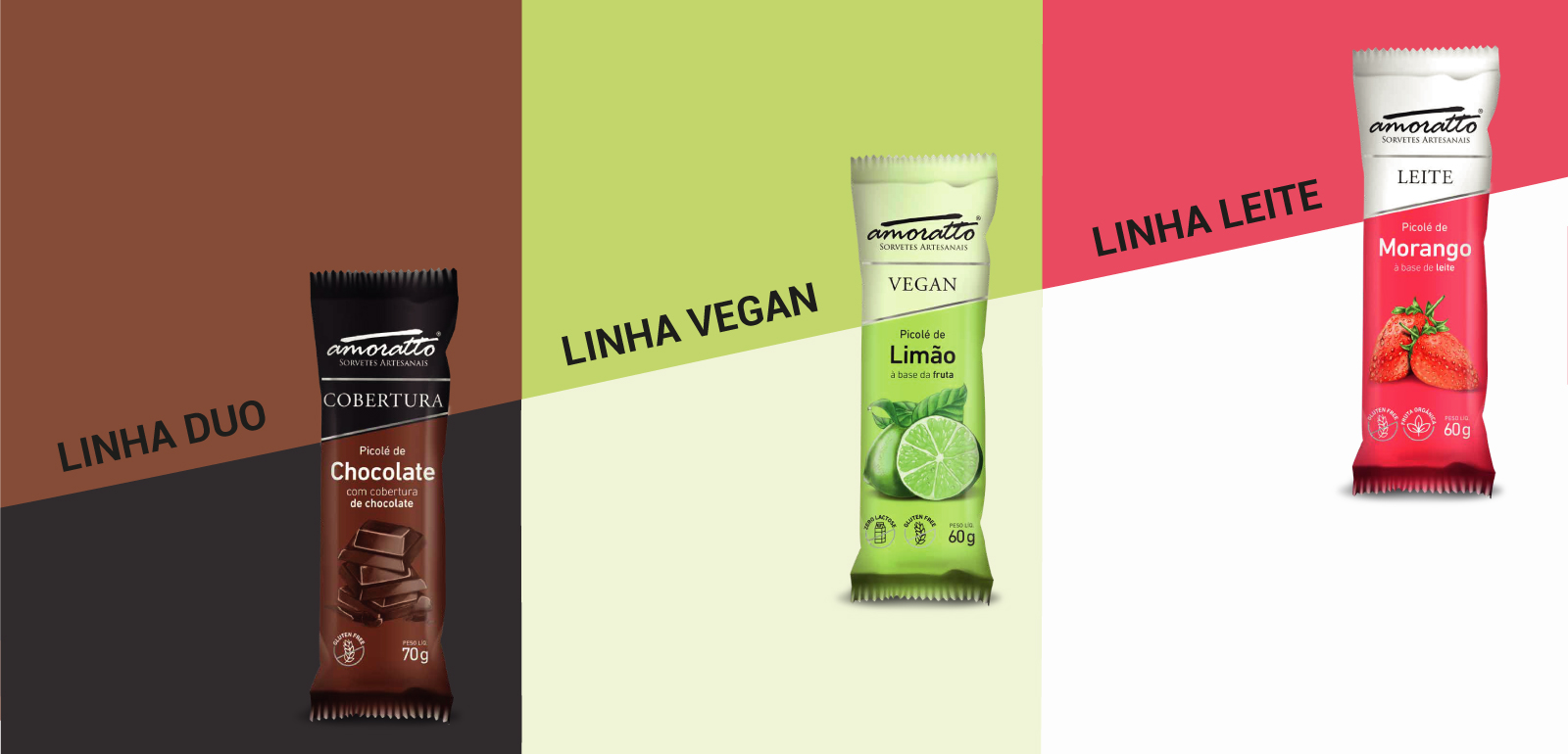 O principal objetivo do projeto era modernizar os rótulos dos picolés e seguir o padrão visual dos demais produtos da Amoratto, que são a torta de sorvete e as embalagens de sorvetes.Outro desafio do projeto foi em relação ao número de cores da impressão. Deveriam rodar na mesma bobina de impressão pelo menos 3 sabores, uma questão de praticidade para a Amoratto porque permite que eles imprimam menores quantidades de sabores e não tenham excedentes e diminui os custos. No entanto, isso significava trabalhar com menos cores para cada sabor.Como solução, cada picolé trabalha com 5 cores, CMYK + cor especial Pantone. Isso permitiu a utilização de ilustrações coloridas e uma cor especial para dar destaque ao sabor (Morango, chocolate, coco, etc) - podendo ter até 3 cores especiais por bobina sem problemas - sendo a impressão no Offset em até 7 cores.