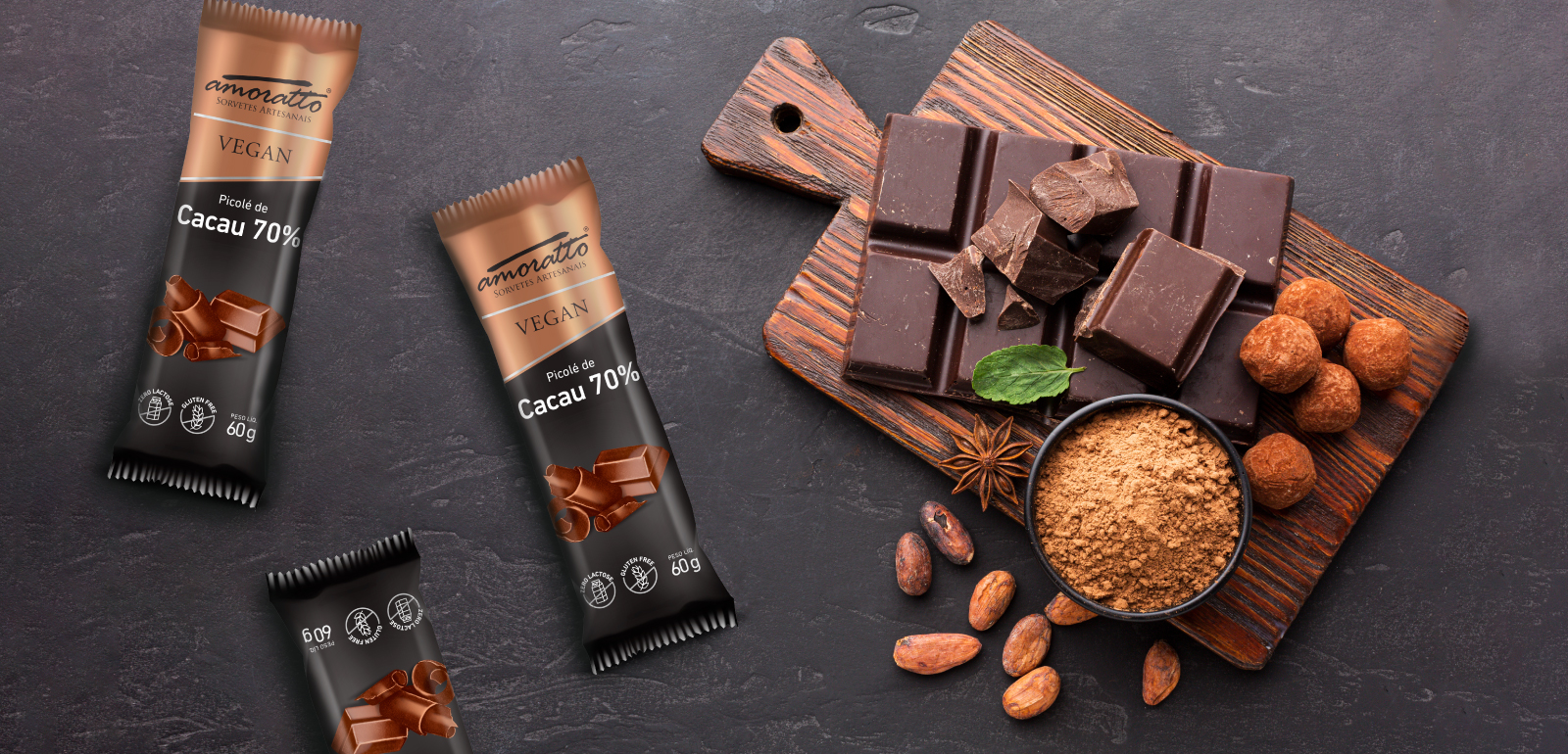 Mas um desafio era: então como diferenciar as diferentes linhas de picolés. Cobertura, Vegan e Leite, já que não poderia ser por meio de cores especiais? Para gerar máximo contraste entre as linhas, nós trabalhamos com um corte transversal na parte frontal e superior da embalagem. Na linha leite, essa tarja seria branca - sensação de cremosidade -, na cobertura seria preta (uma linha mais premium e também remete ao chocolate da cobertura) e na linha vegan trabalha com o mesmo tom Pantone especial só que com tonalidade mais baixa. Assim as linhas se diferenciam não somente pelo nome, em destaque na frente da embalagem, mas por cor - sem ultrapassar o limite do maquinário de impressão.