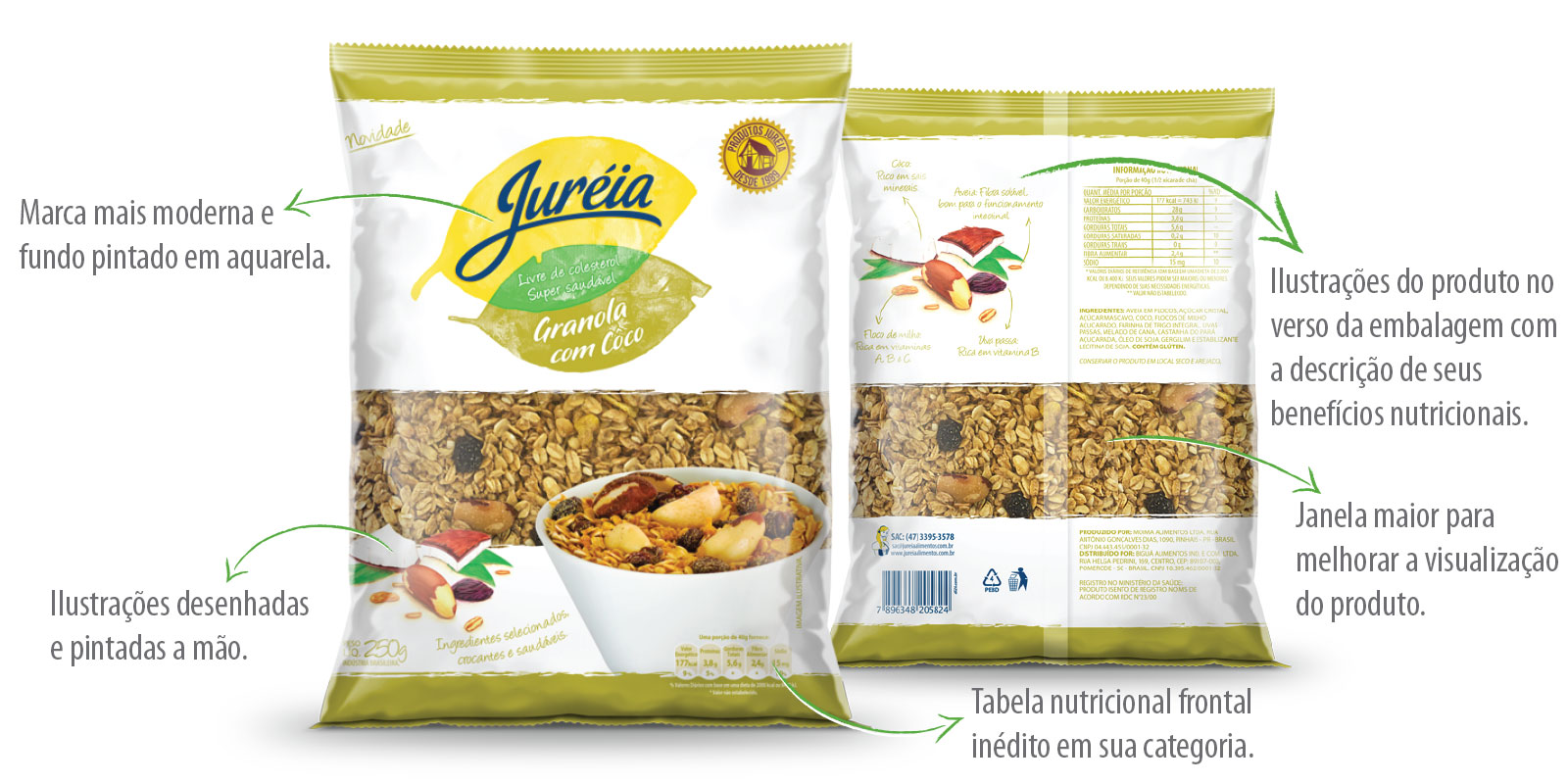 As novas embalagens da Juréia foram meticulosamente desenvolvidas com o objetivo de ressaltar o caráter natural dos produtos. Para isso, foram utilizadas fontes manuscritas, ilustrações desenhadas e pintadas à mão e traços mais irregulares que comunicam autenticidade artesanal.
