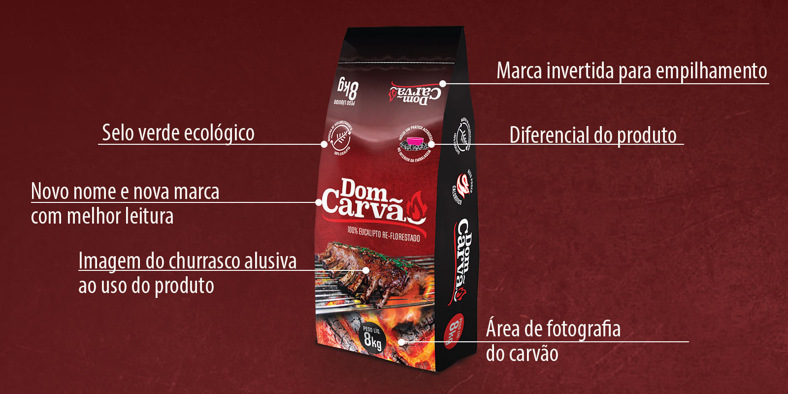 O Dom Carvão possui um público em sua maioria masculina - apesar de também haver compradoras mulheres. O destaque das cores escuras, a tipografia mais agressiva, e a ideia do churrasco está vinculada ao público-alvo de forma a aproximá-lo mais da marca.