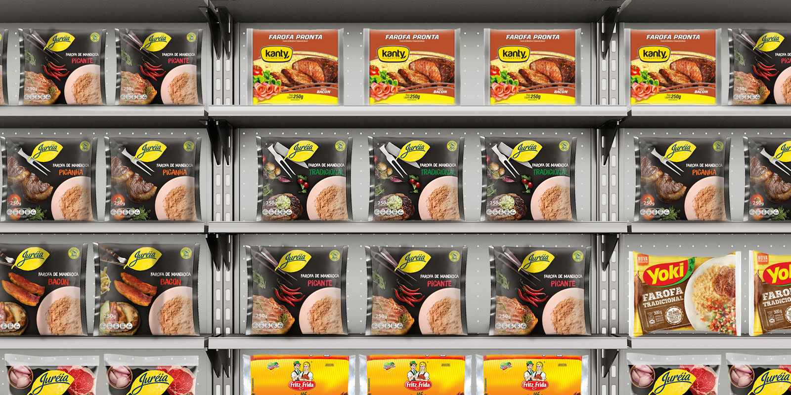 As embalagens de farofa da Juréia se aproximam de conceitos premium, trazendo ideias mais autênticas e sofisticadas de churrasco do que outras marcas.