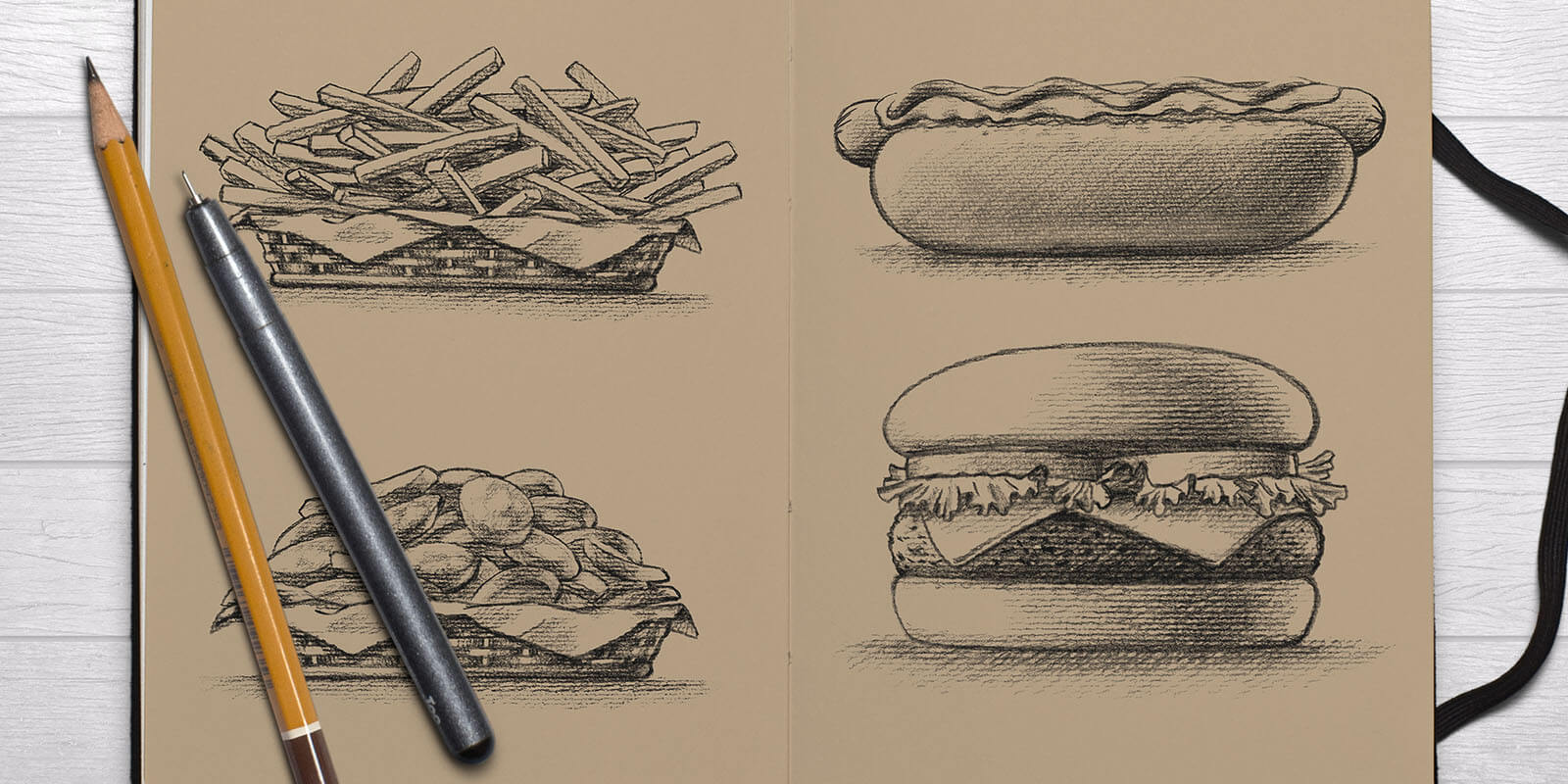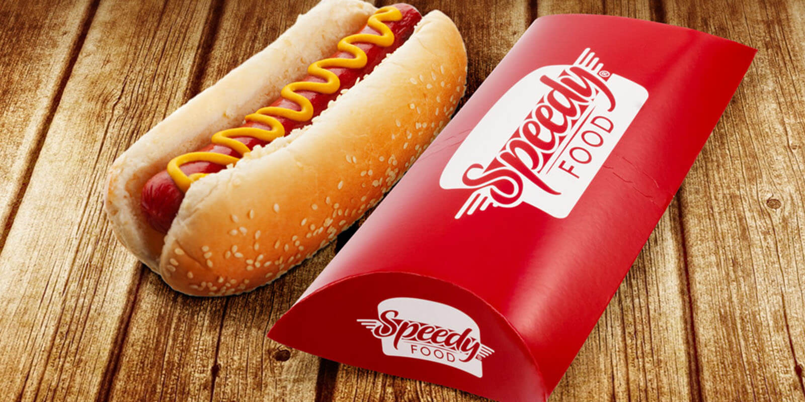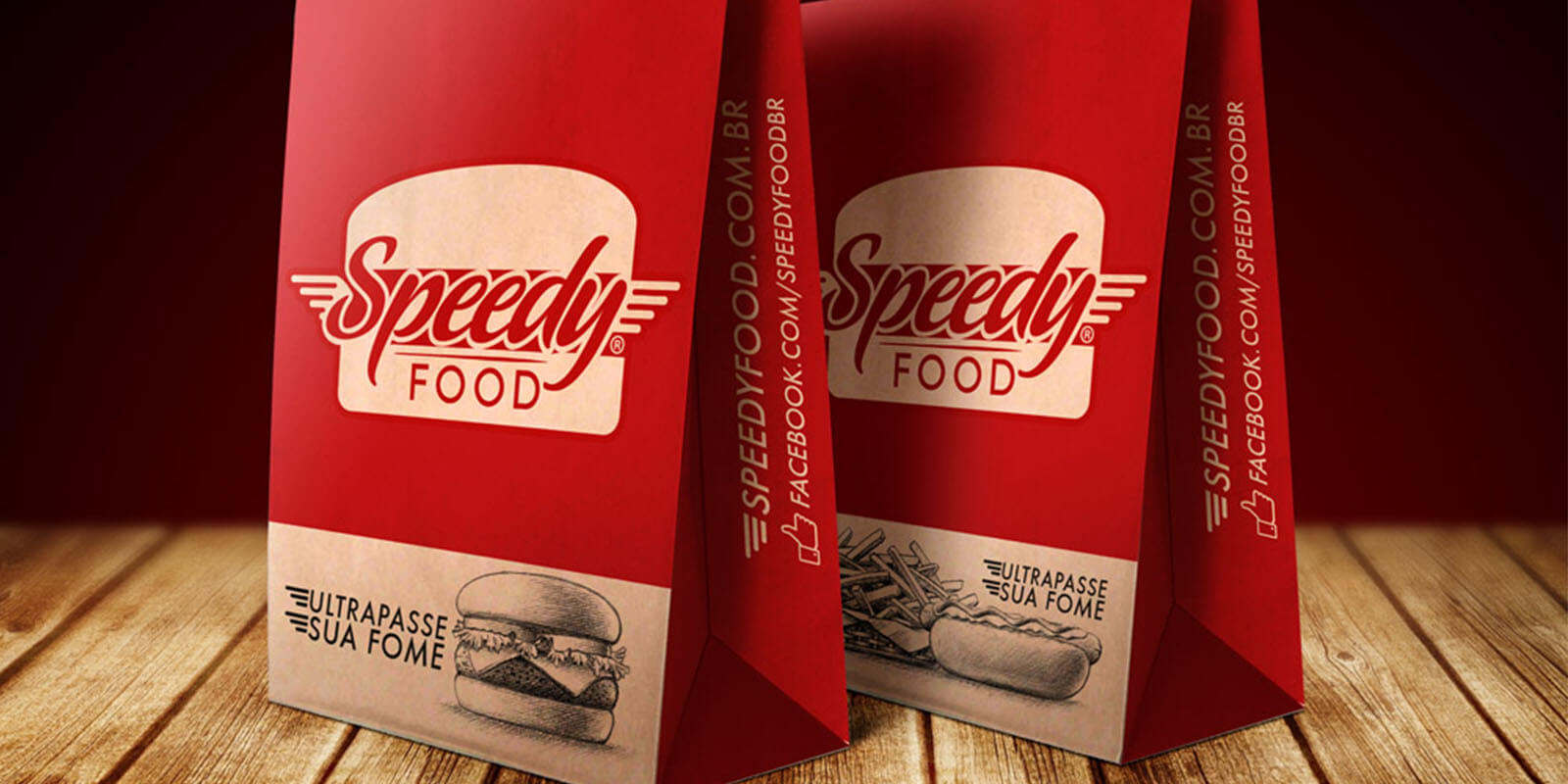 Foram desenvolvidas ilustrações manuais dos lanches da Speedy Food. A utilização delas em um fundo vermelho - contrastante, que chama atenção - e impresso no papel kraft agrega o diferencial de qualidade de um produto de fast food que a marca busca. Também reforça a ideia do artesanal - caseiro - e gera maior confiança do público.