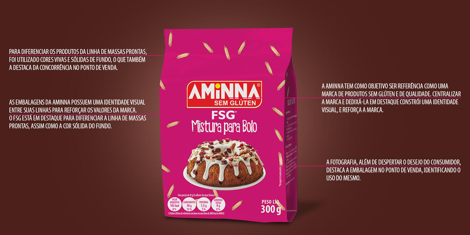 O novo projeto de design de embalagem para as misturas prontas de bolo e pão da Aminna tinha como objetivo se diferenciar da concorrência, destacando-se das demais e assim aumentando suas vendas. O design deve ressaltar as qualidades da marca e do produto, como um produto diferente e de alta qualidade que busca excelência. Um dos requisitos da marca para o projeto era a utilização de cores fortes e destacadas. Além de, como visto nas outras linhas de farináceos da marca, o destaque da logo como reforço de sua busca em se tornar referência como uma produtora de alimentos funcionais sem glúten.Palavras-chave: Moderno. Natural. Excelência. Artesanal.