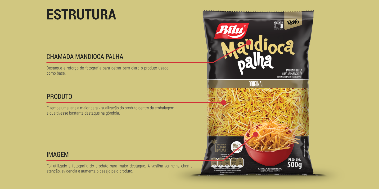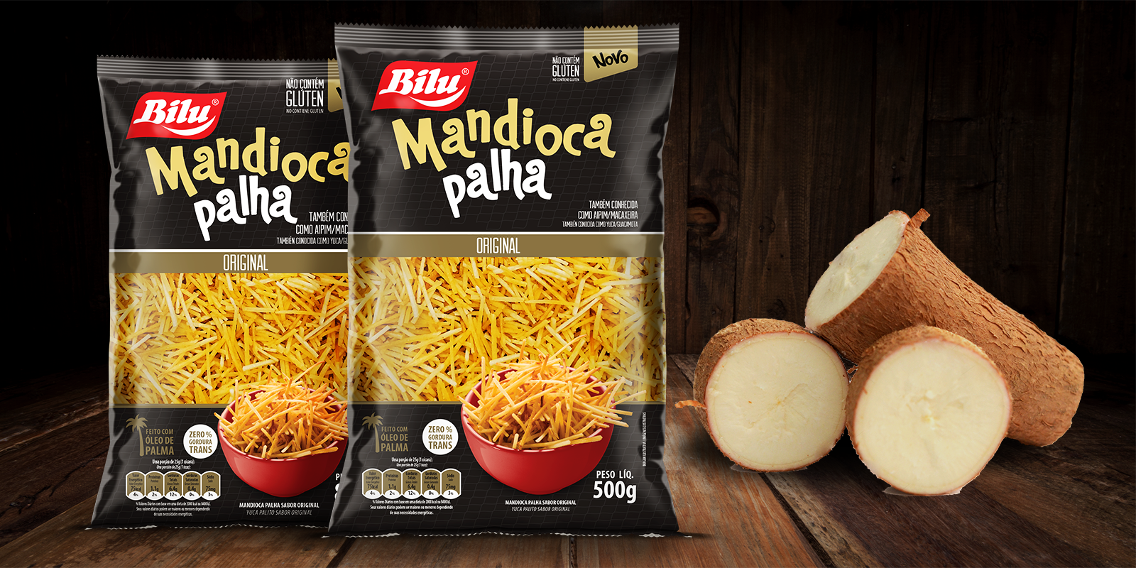 O projeto tem como objetivo o desenvolvimento de uma embalagem que transmita os diferenciais saudáveis e qualitativos do produto. Ela deve manter um vínculo com a linha desenvolvida para o restante dos produtos de mandioca. A mandioca palha se diferencia da batata palha da mesma linha, se destacando como diferencial, da marca Bilu.Também pode ser referida como aipim.