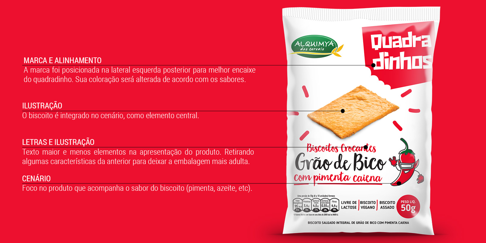 Projeto de design de criação de embalagens para biscoito dos produtos Quadradinhos da marca Alquimya.