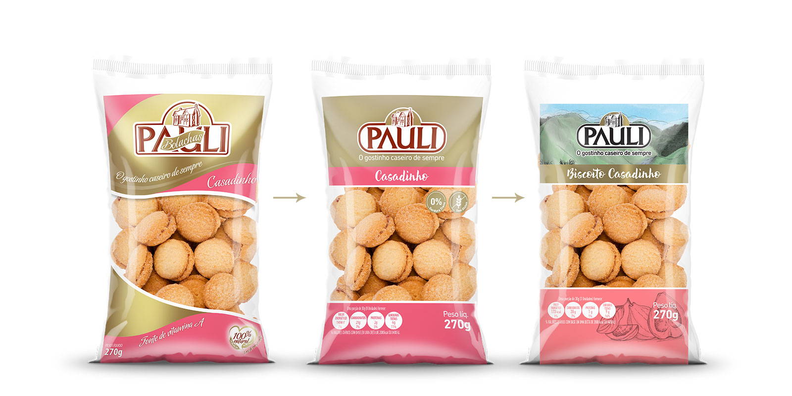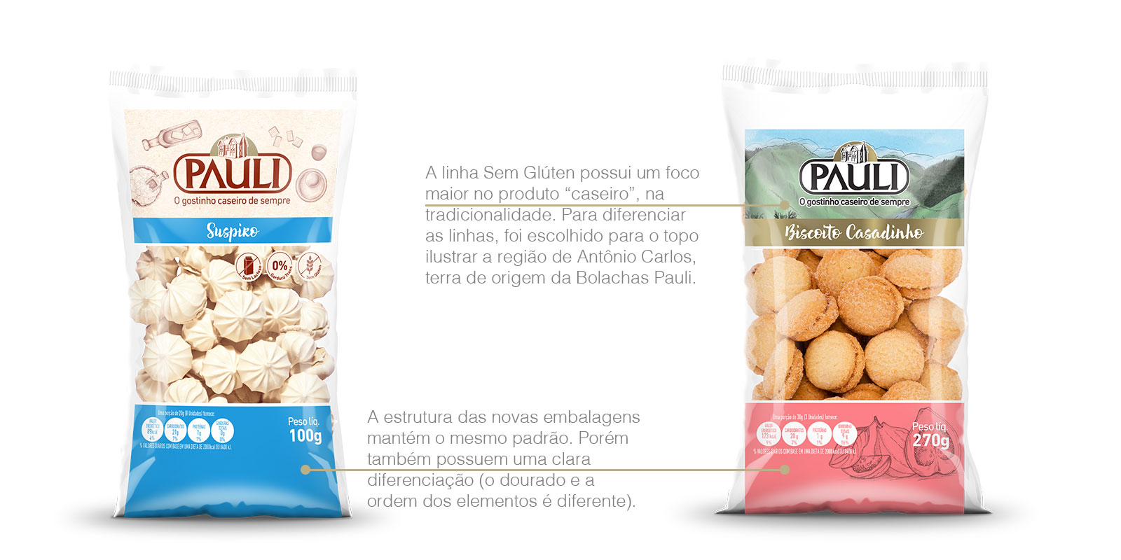 O projeto consistiu no redesign das embalagens da Linha Com Glúten para a Bolachas Pauli. A nova linha deveria seguir o padrão das novas embalagens sem glúten, ainda que se destacando das demais no ponto de venda.Foi mantido a mesma estrutura das novas embalagens, focando na cor dourado - ao invés do fundo branco da linha sem glúten. No entanto, a linha ainda se posiciona como bolachas mais saudáveis e caseiras. Como reforço, a parte superior da embalagem ganhou uma ilustração colorida e leve da região da empresa, Antônio Carlos.